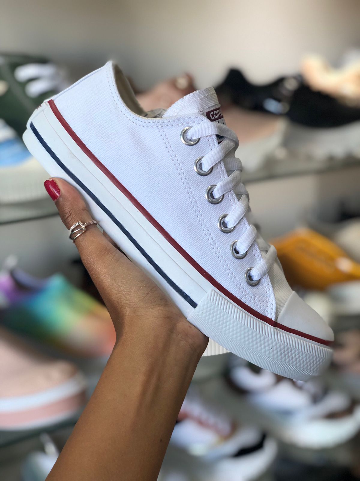O cabedal é confeccionado em lona resistente, um tecido respirável que permite a circulação de ar, mantendo seus pés frescos e confortáveis. O design clássico da Converse, com a icônica biqueira de borracha e os ilhós metálicos, confere um apelo vintage e versátil a esse calçado.